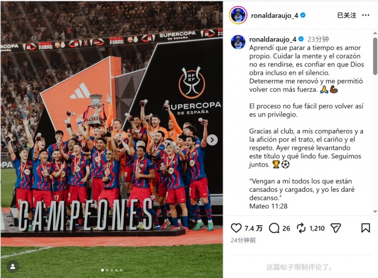 阿劳霍社媒晒出捧杯像片,并写说念:“我学会了应时停驻是倨傲,呵护心灵并非烧毁,而是服气天主在落寞中仍是剖析神迹。停驻让我焕然重生,得以更强地面转头。
