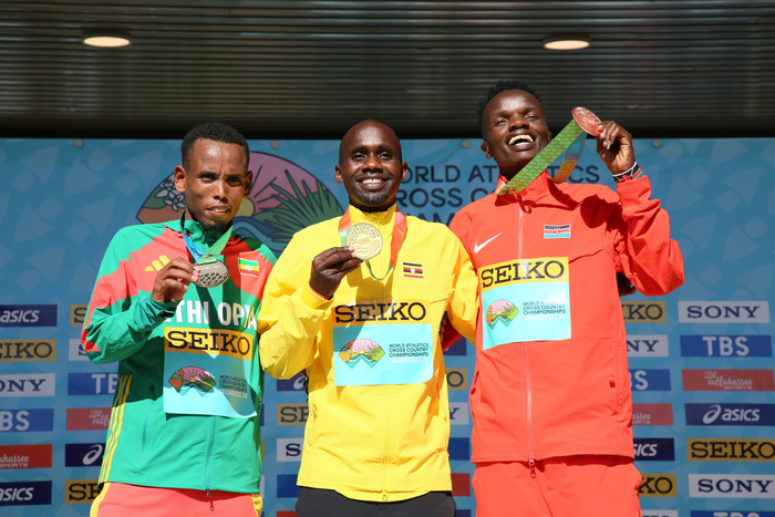 1月10日,男人成年组冠军乌干达选手吉普利莫(中)、亚军埃塞俄比亚选手阿雷加维(左)和季军肯尼亚选手丹尼尔在授奖庆典上合影。
